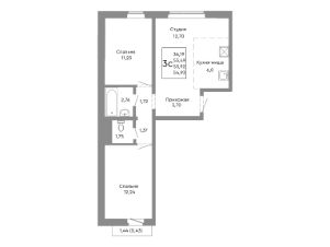Продаётся 3-комнатная квартира в строящемся доме (Дом 13), срок сдачи: II-кв. 2027, общей площадью 53.49 кв.м., на 2 этаже.