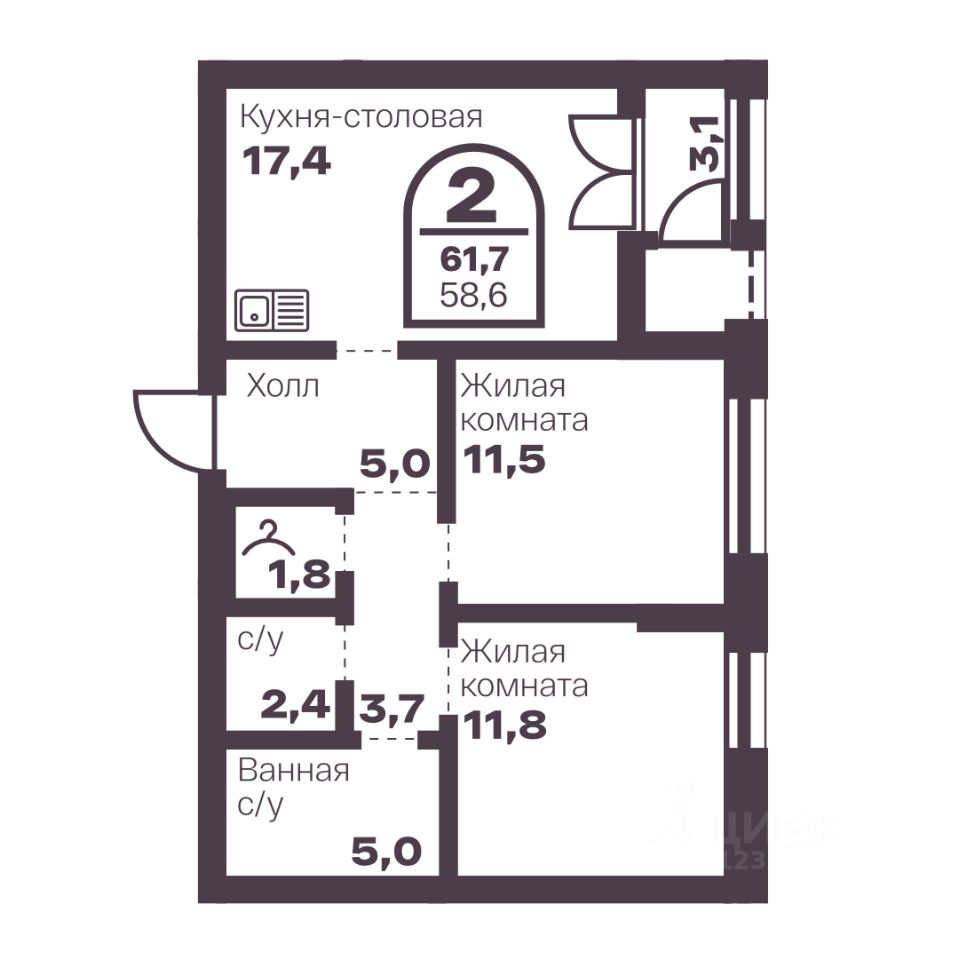 Общая площадь58,6 м2