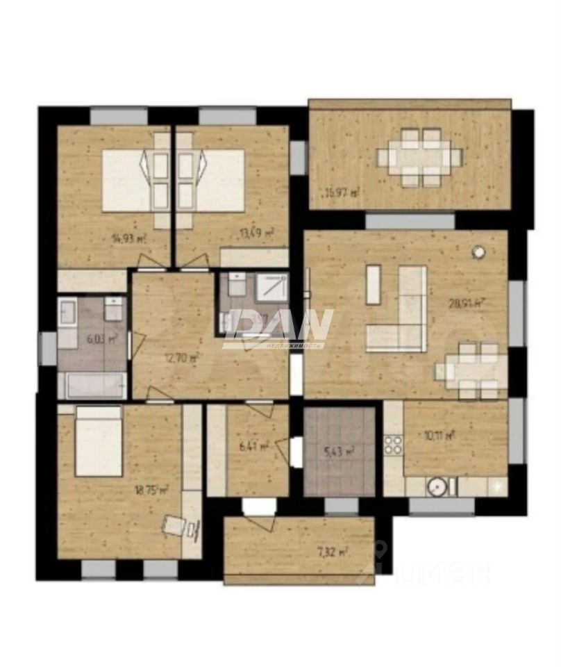 В настойщее время внутри дома одна несущая стена, разделяющая дом на две половины: гостевая и приватная зоны. Есть возможность сделать индивидуальную планировку под потребности вашей семьи. На плане лишь один из вариантов, как можно распорядиться пространством.