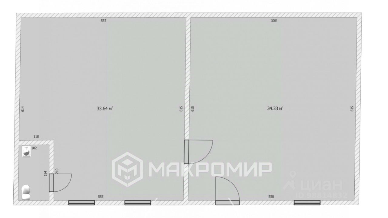 Арт. 116404818 Офисное помещение на 1-м этаже двухэтажного здания в центре города. Общая площадь 68,4 м², состоит из двух равных кабинетов по 34 м². и санузла.