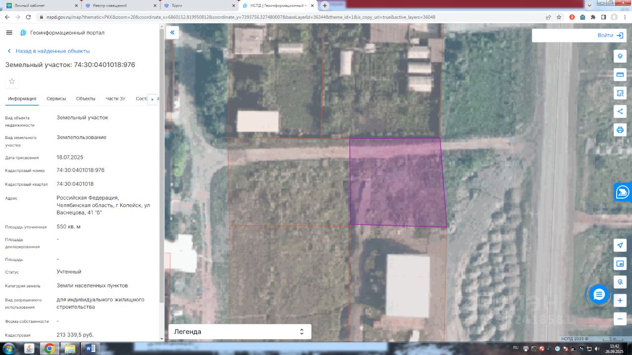 Данные получены с сайта ГИС Торги. Земельный участок с кадастровым номером 74:30:0401018:976 площадь 550 по адресу Российская Федерация, Челябинская область, г Копейск, ул Васнецова, 41 ''б''