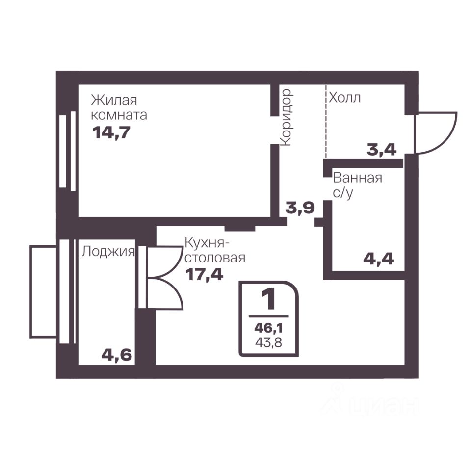 Общая площадь43,8 м2