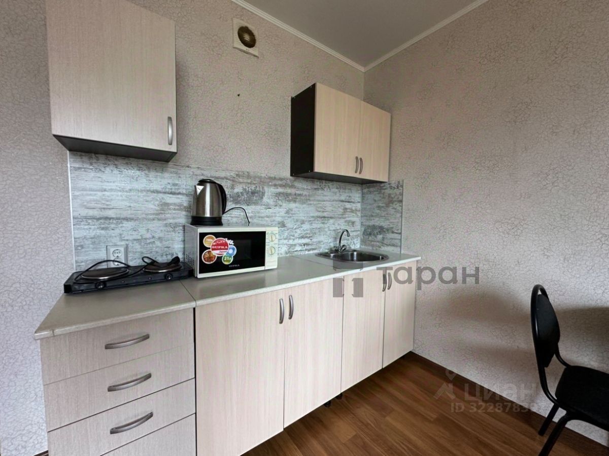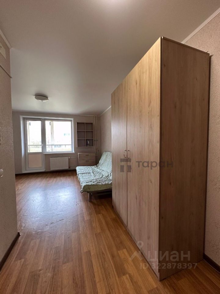 Студия в мкр. Просторы с чистовой отделкой, в комнате поклеены обои, на полу линолеум, белый натяжной потолок, в сан узле кафель от пола до потолка, регулируемые радиаторы отопления, входная металлическая дверь. Балкон застеклен, пол на балконе застелен деревом. Вид на лес.