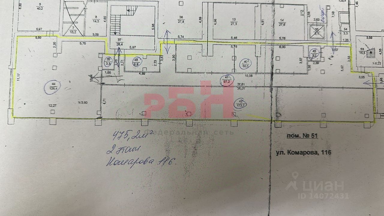 ОТ СОБСТВЕННИКА БЕЗ КОМИССИИ. Сдам Помещение свободного назначения, 475,2 м² на 2-ом этаже 16-ти этажного здания по адресу: г. Челябинск, ул. Комарова, д 116