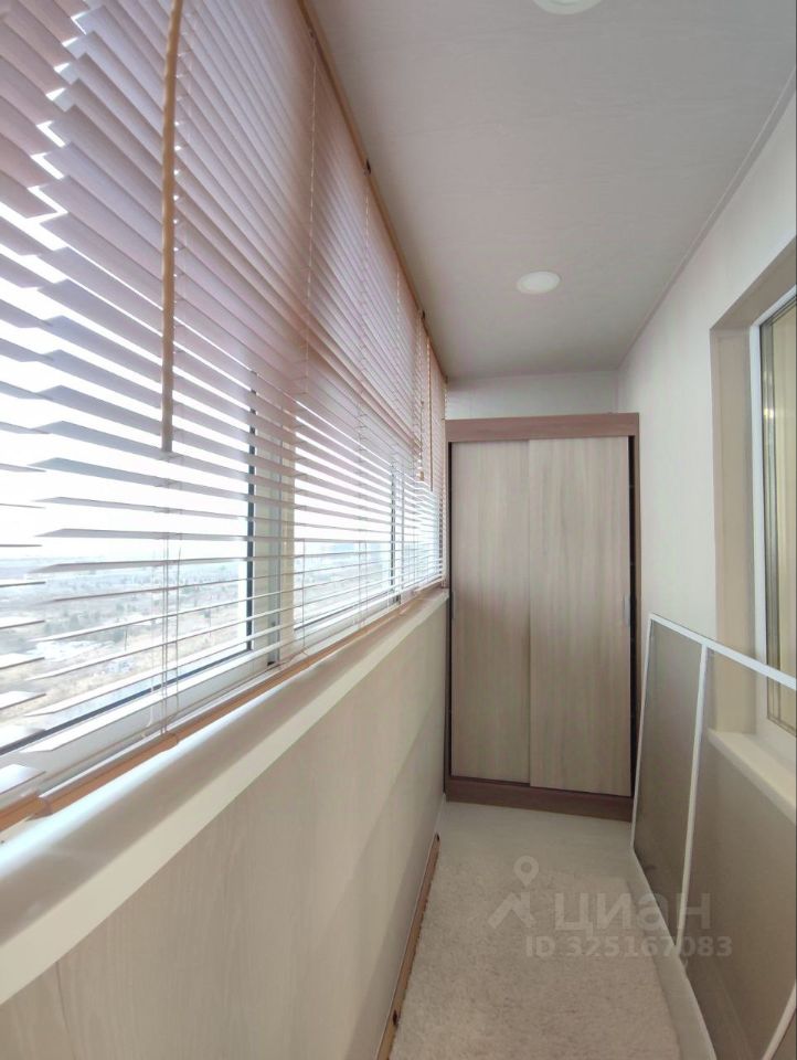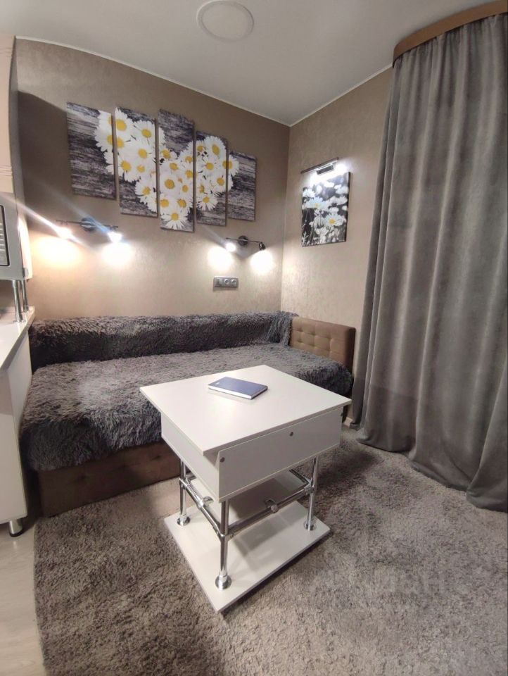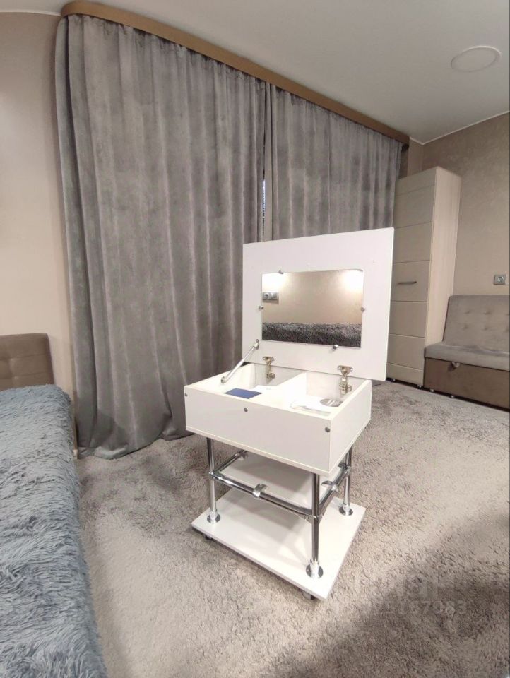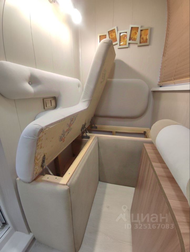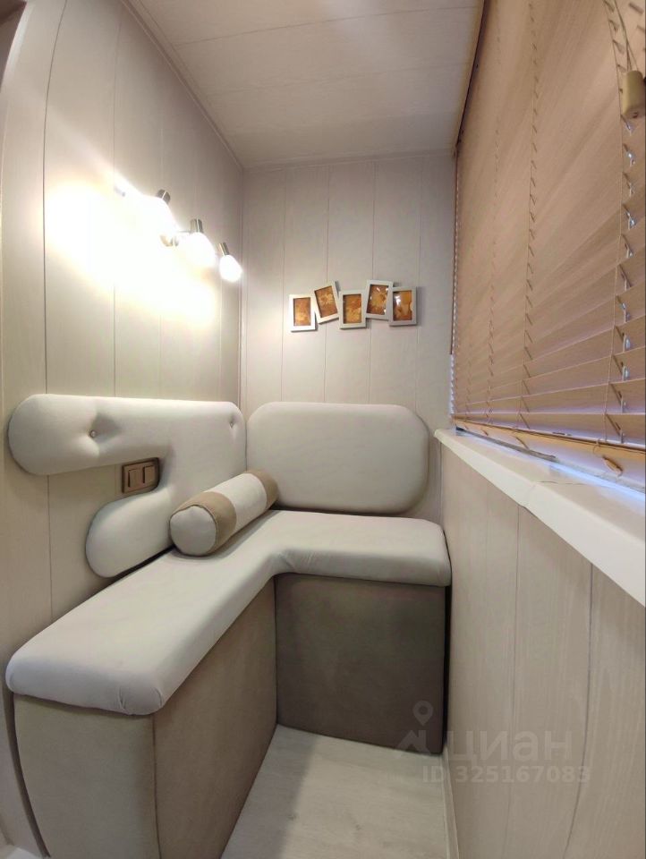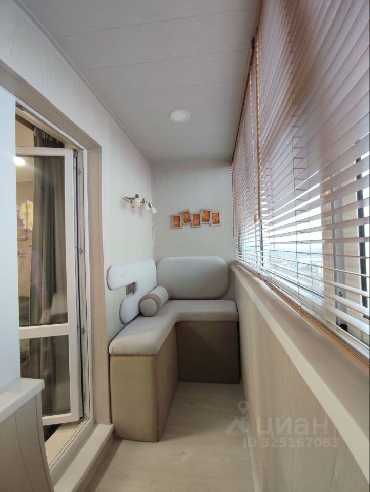 Продуманный до мелочей уют: студия 24,4 м² в мкр. Белый Хутор, 9 этаж. Из лоджии открывается шикарный вид на водохранилище — здесь оборудована зона отдыха с диваном, столиком, подсветкой и шкафом для хранения.