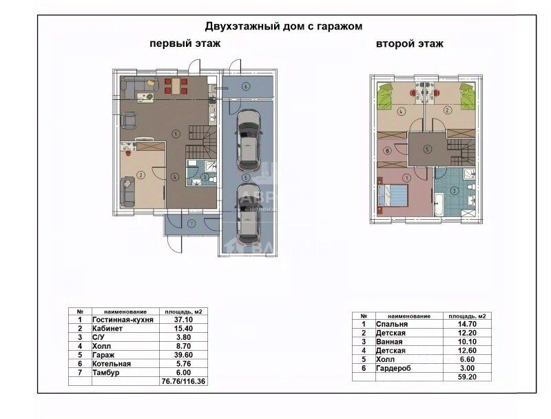 Просторная планировка: ПЕРВЫЙ этаж: -Гараж на 2 машины 50 кв.м. - Котельная - 6 кв.м. - Кабинет -15,4 кв.м. -Тамбур 6 кв.м. -Светлая кухня-гостиная 37 кв.м. с выходом на участок