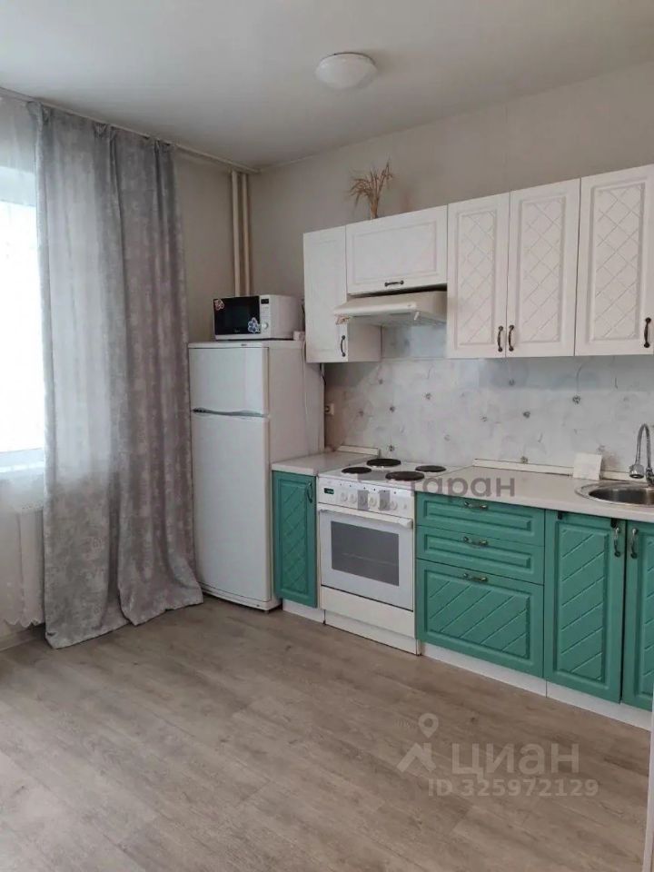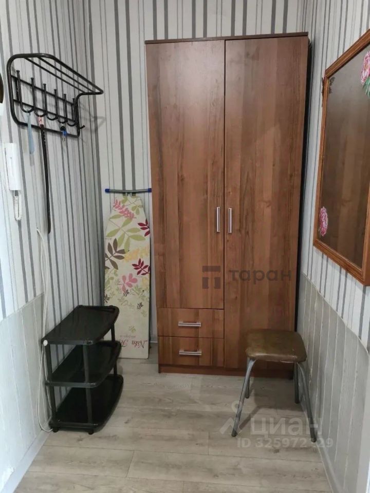 Диван, шкаф как гардеробная, в спальне диван, обеденный стол, в кухне кухонный гарнитур с плитой и раковиной, холодильник+ микроволновка, чайник, обеденная зона у дивана и несколько табуретов.