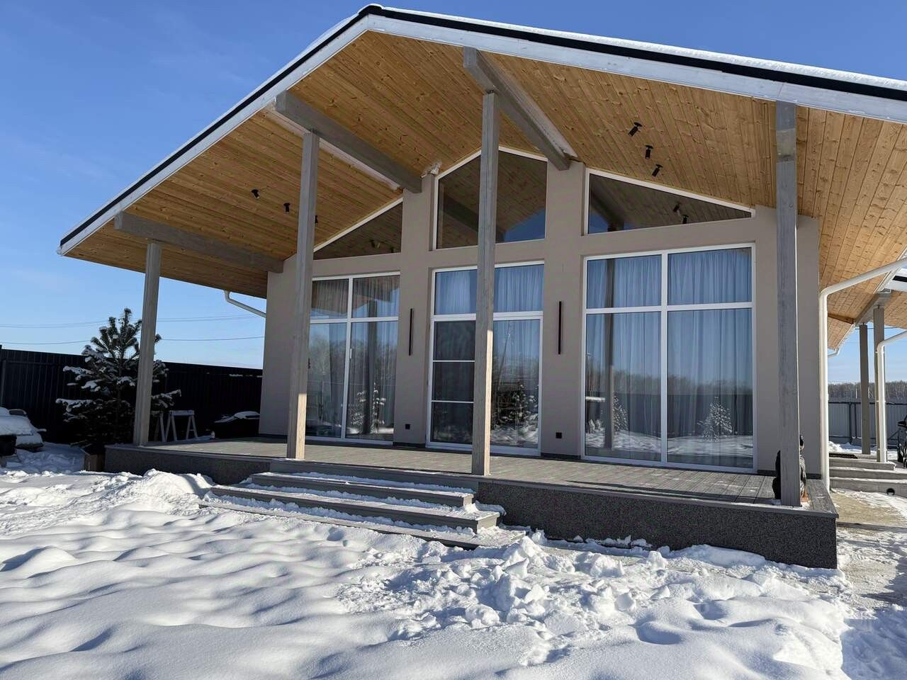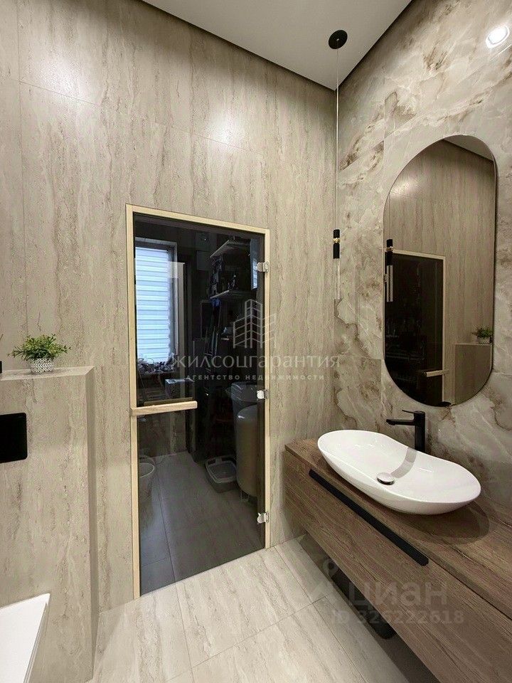 Планировка удобная, гостиная с панорамными окнами и высотой потолка 5.4 м в самом высоком месте, площадь гостиной 37 кв.м, с выходом на террасу 30 кв м, 3 отдельные комнаты, одна из комнат мастер-спальня, со своим санузлом 16 кв м, спальни 14 и 10 кв м, 2 санузла.