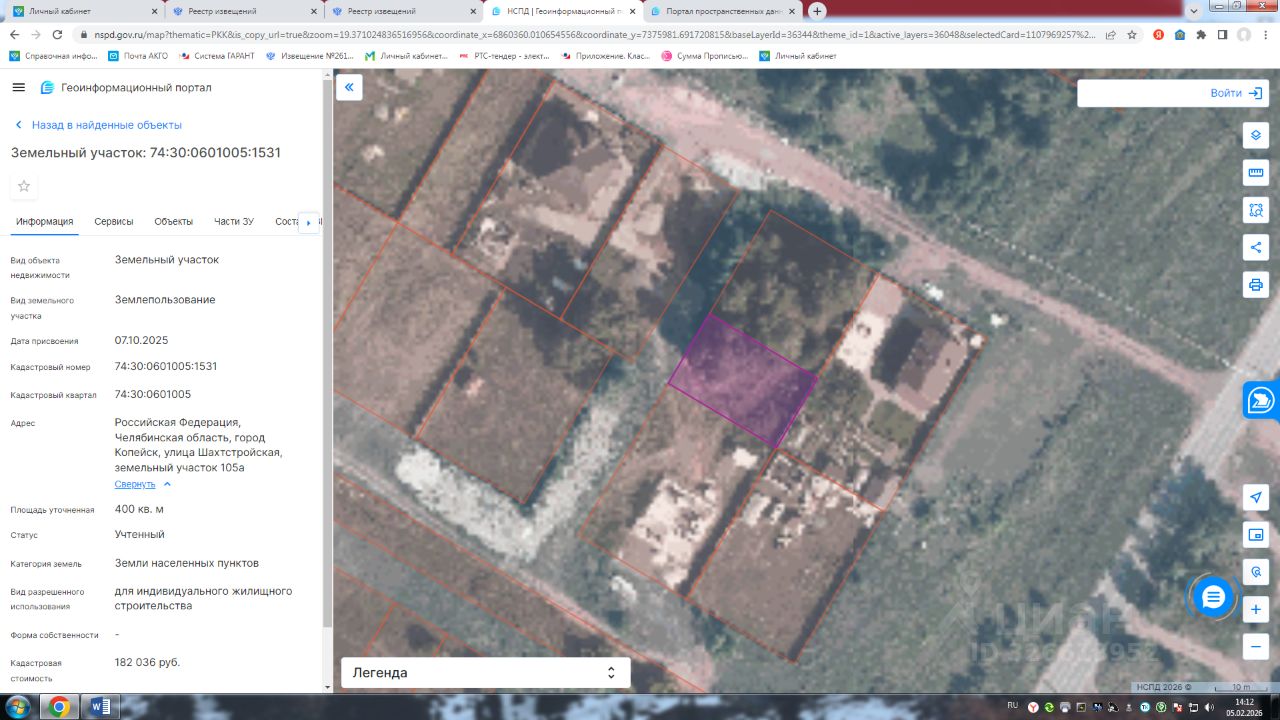 Данные получены с сайта ГИС Торги. Земельный участок с кадастровым номером 74:30:0601005:1531 площадь 400 по адресу Российская Федерация, Челябинская область, город Копейск, улица Шахтстройская, земельный участок 105а