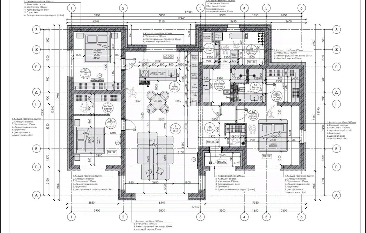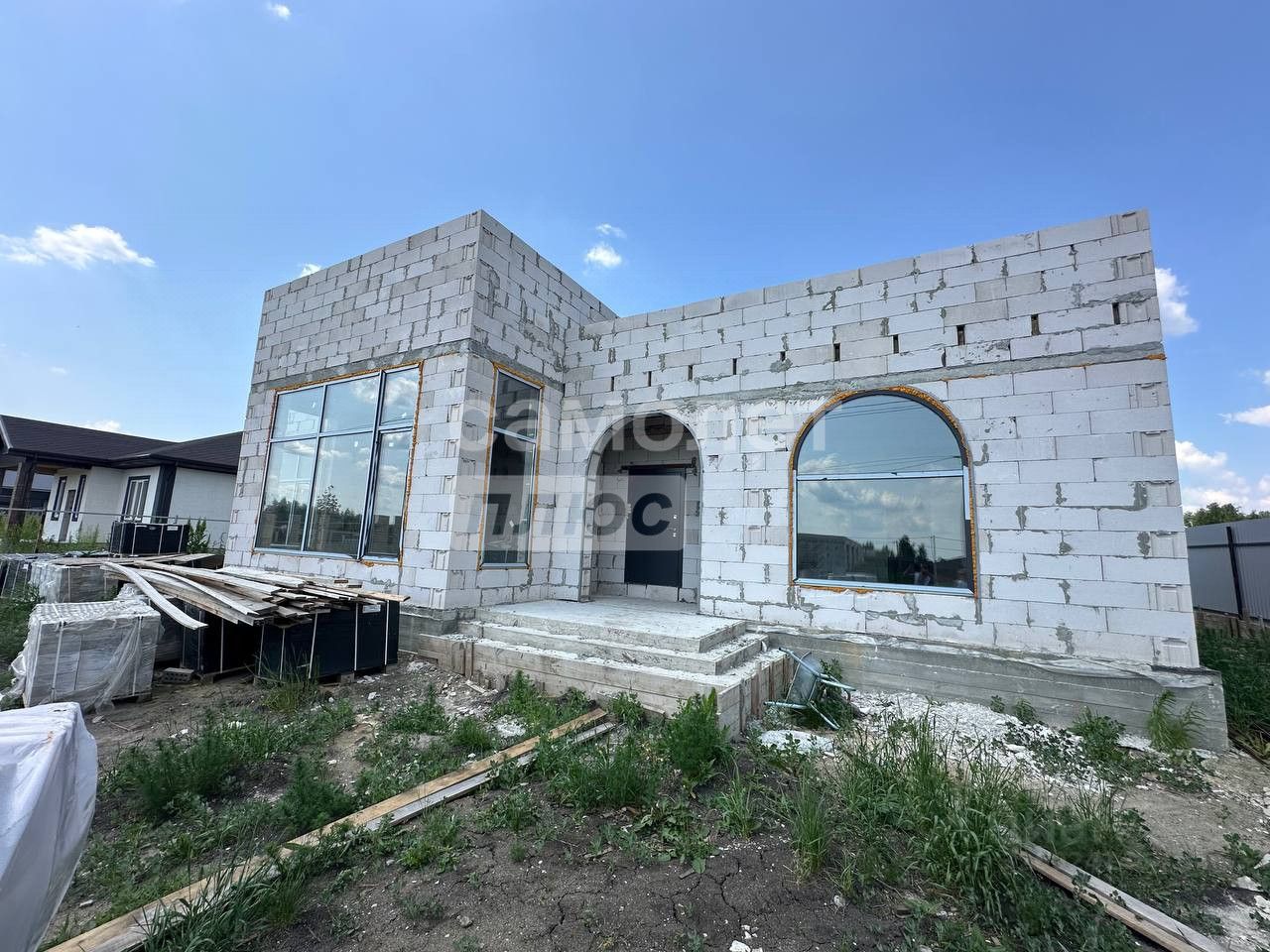 Преимущества: • Огромная кухня-гостиная 50 м² с витражными окнами и потолками 4,2 м — свет и воздух каждый день. • 3 спальни: две по 16 м² и мастер-спальня 17 м² с гардеробной — уют и личное пространство. • Удобное хозпомещение — можно сделать прачечную, систему хранения, котельную. • Дом построен из тёплого блока, энергоэффективный и надёжный.